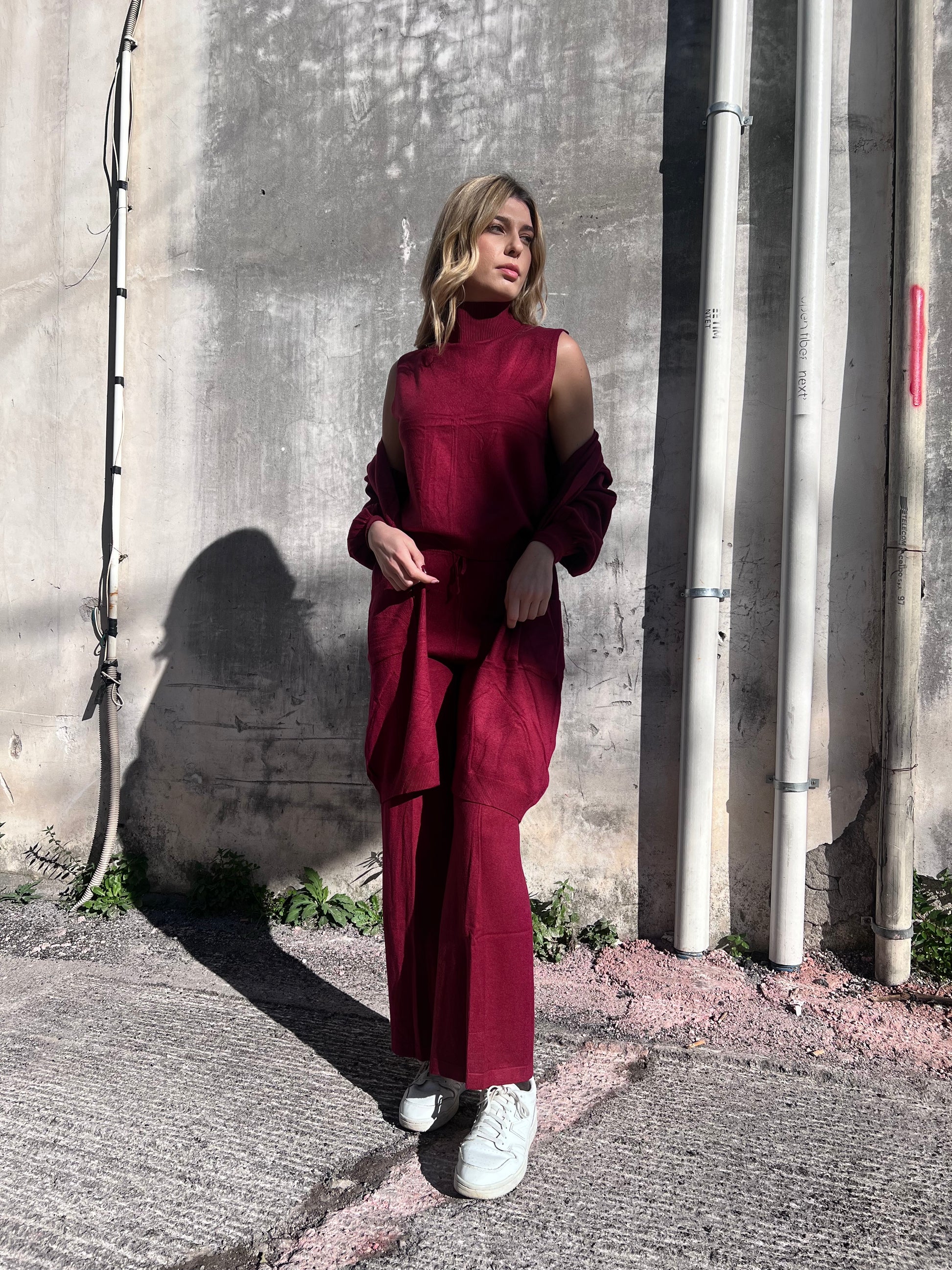 Coordinato Donna 3 Pezzi Lanetta Rasata - Top Lupetto, Cardigan e Pantalone Palazzo