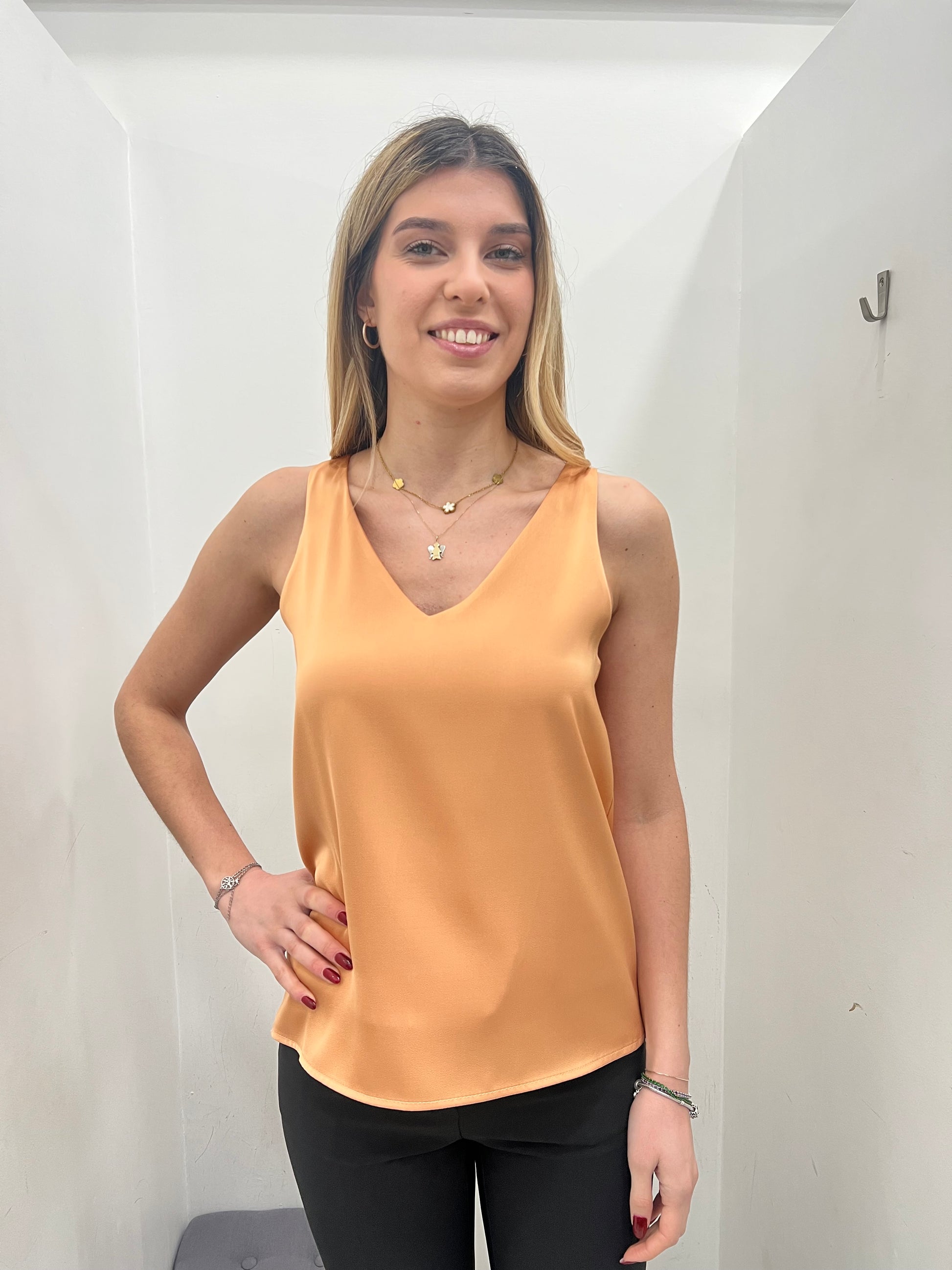 Top donna a canotta in tessuto scivoloso lucido.